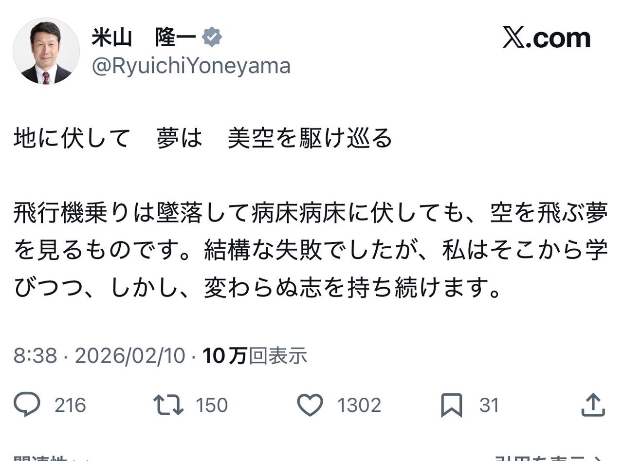 — 米山 隆一 (@RyuichiYoneyama) February 9, 2026