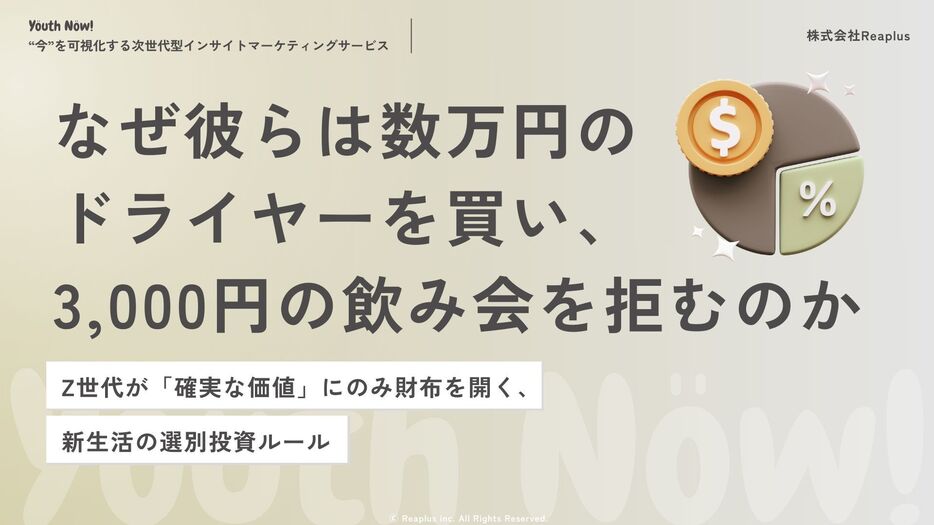株式会社Reaplus が行った Z世代を対象に行った 新生活における消費行動と価値基準に関する定性調査 (座談会) によると、Z世代は 「節約志向」 なのではなく、“失敗したくない” という心理を起点に、投資対象を極端に選別している という事実が浮かび上がってきた。