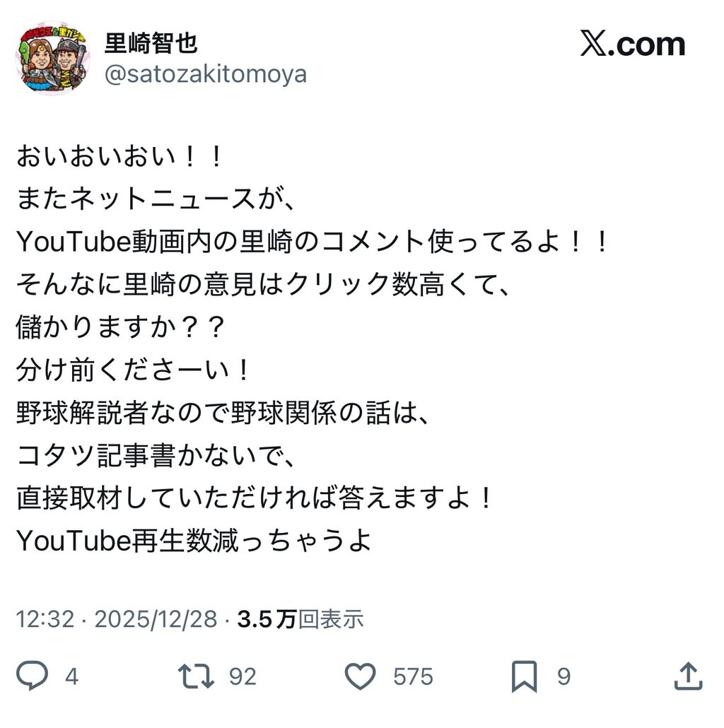 千葉ロッテマリーンズ終身名誉大天使里崎さん、コタツ記事にブチギレ… スポンサーリンク まとめロッテ 2026.01.04 スポンサーリンク 1: 名無しさん 2025/12/28(日) 13:30:22.194 ID:W.HXgRuQT しゃーない https://www.jprime.jp/articles/-/39833# 続きを読む Source: まとめロッテ