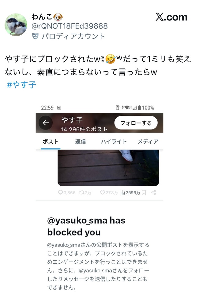 【悲報】芸人やす子、「つまらない」と言った一般人をブロックしてしまう スポンサーリンク なんJ PRIDE 2026.01.08 スポンサーリンク 引用元: https://nova.5ch.net/test/read.cgi/livegalileo/1767862841/ 1: それでも動く名無し 2026/01/08(木) 18:00:41.03 ID:Dd3m14sM0 3: それでも動く名無し 2026/01/08(木) 18:01:21.86 ID:YEY8izXsr フワもつまらないぞ 続きを読む Source: なんJ PRIDE